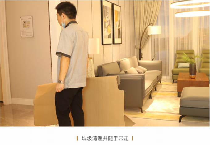 戴上白手套,按顾客要求把货物搬到指定位置,要求轻抬轻放,严禁在地板上拖、拉、推以免损伤顾客家物品。