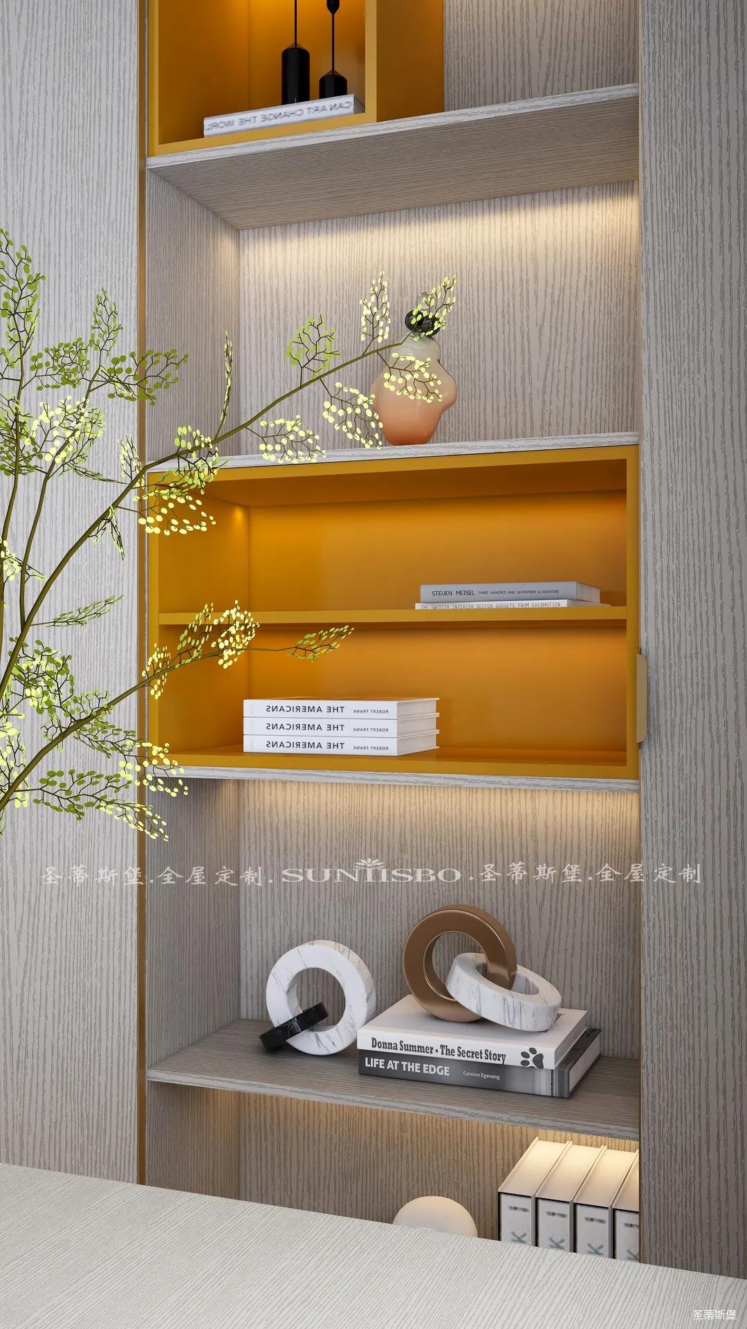 书柜点缀着适当的爱马仕橙,除了自身携带的高贵气质,在聚焦视线的同时,还明确了收纳分区。